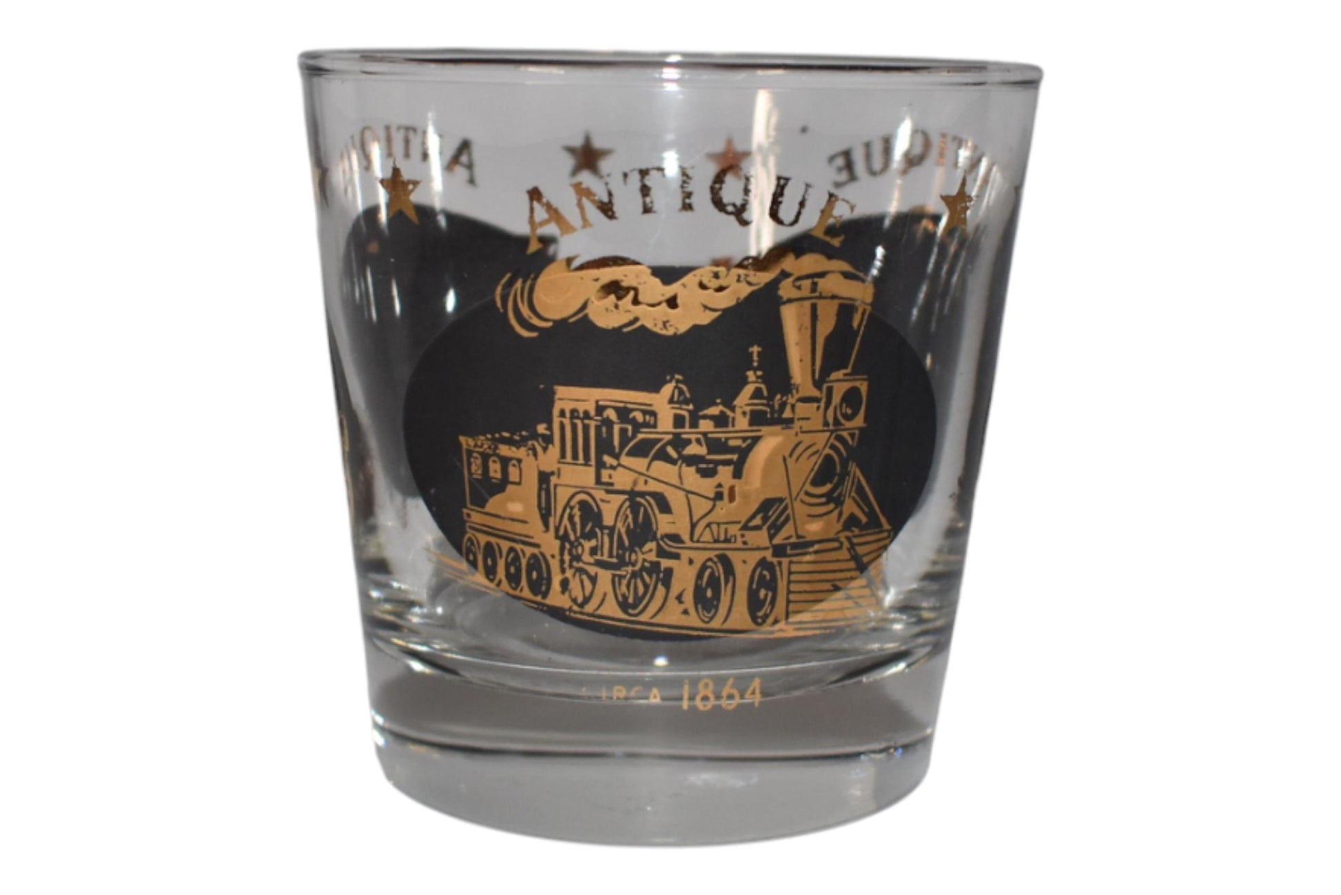 Celebrate the golden age of motoring with this set of six vintage hi-ball glasses featuring black and gold illustrations of antique automobiles, train and steamboat. Each glass showcases charming mid-century artistry, detailed with metallic accents and vintage lettering that captures the spirit of early 1900s travel.