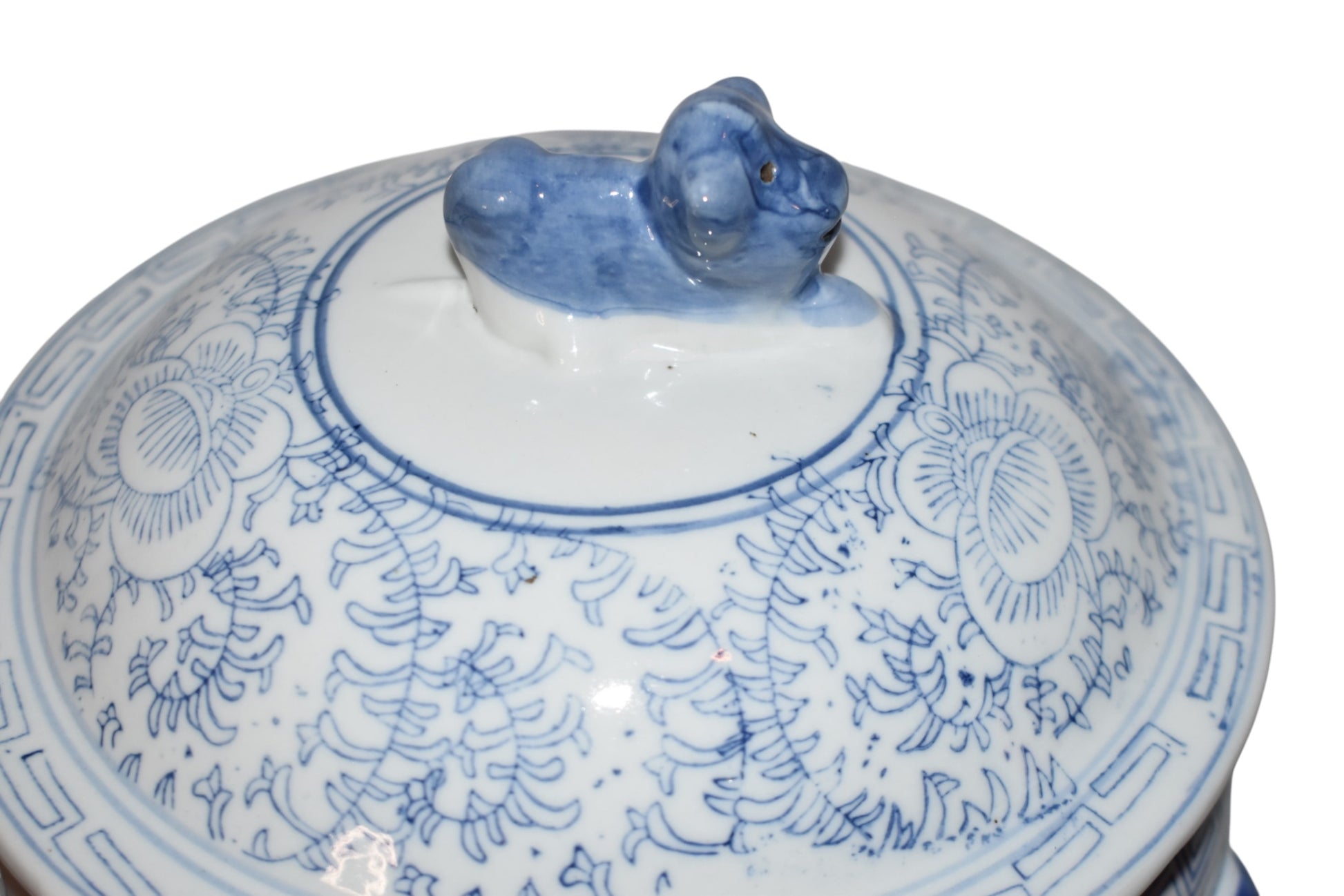 A matched pair of blue and white ginger jars crowned with fierce little Foo Dog finials the kind of pieces that command attention and add instant soul to a space.