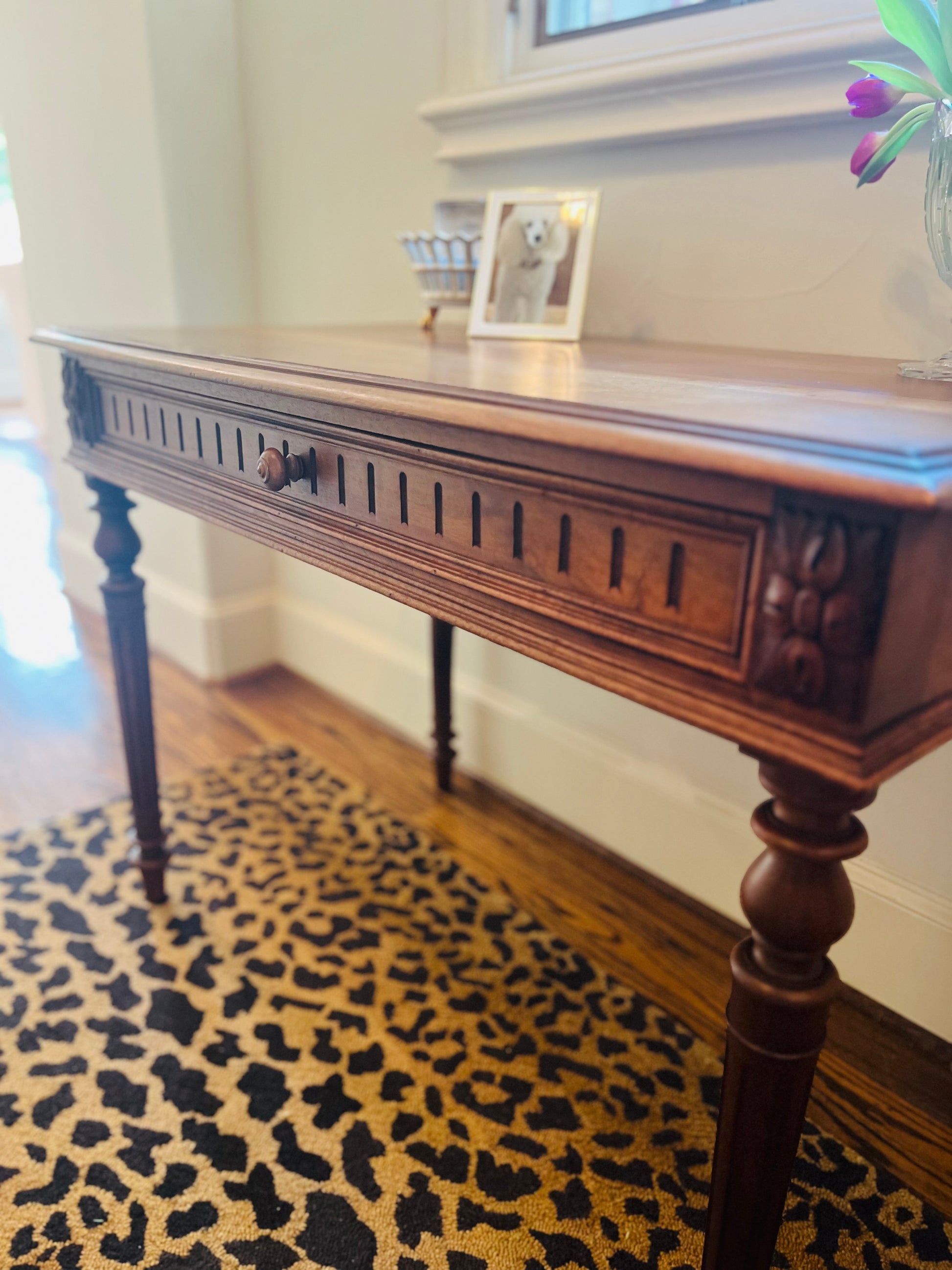 Perfectly proportioned for use as a writing desk, console table, or vanity, this piece blends seamlessly into both traditional and modern interiors. Its warm walnut patina adds depth and sophistication, making it a versatile addition for entryways, bedrooms, studies, or living spaces.