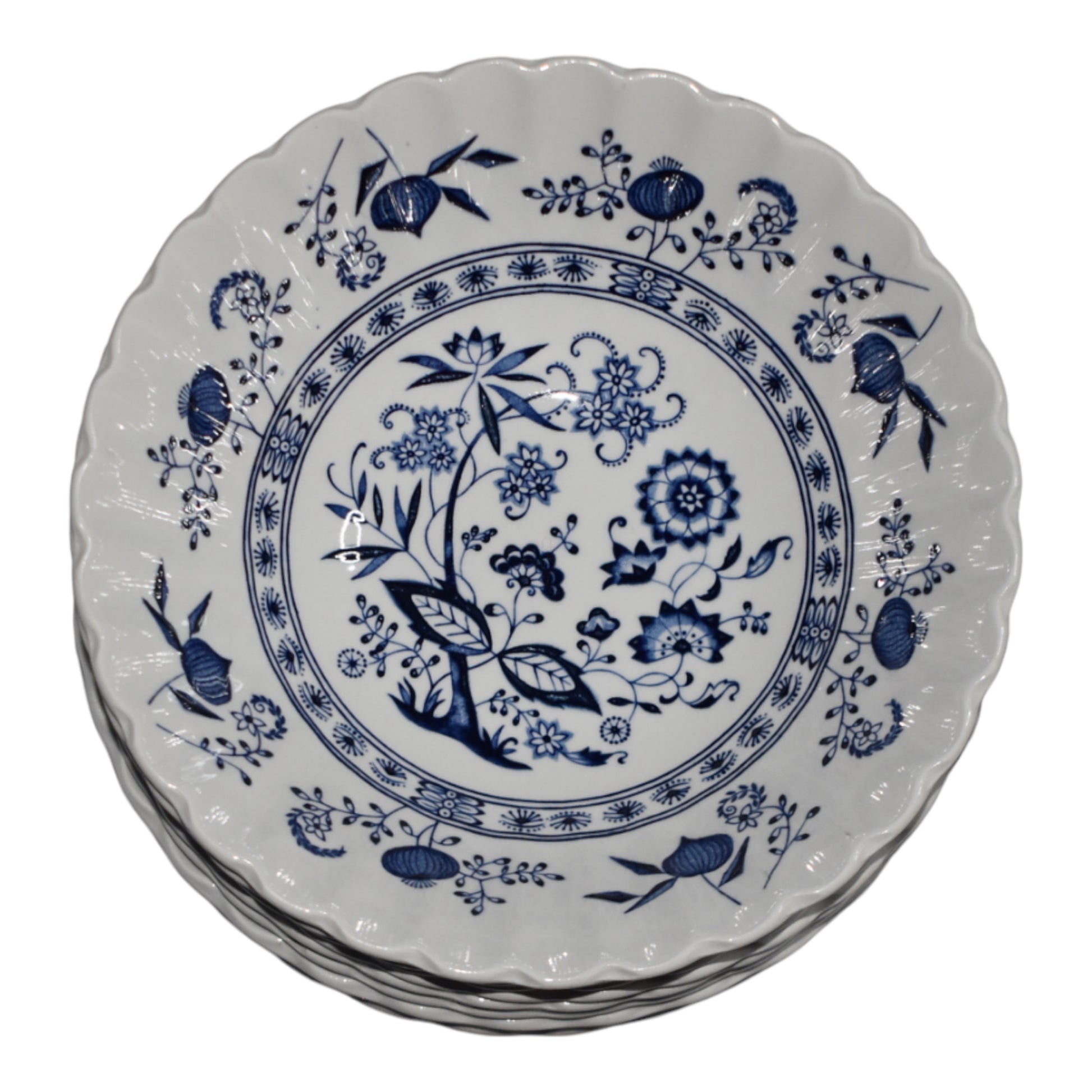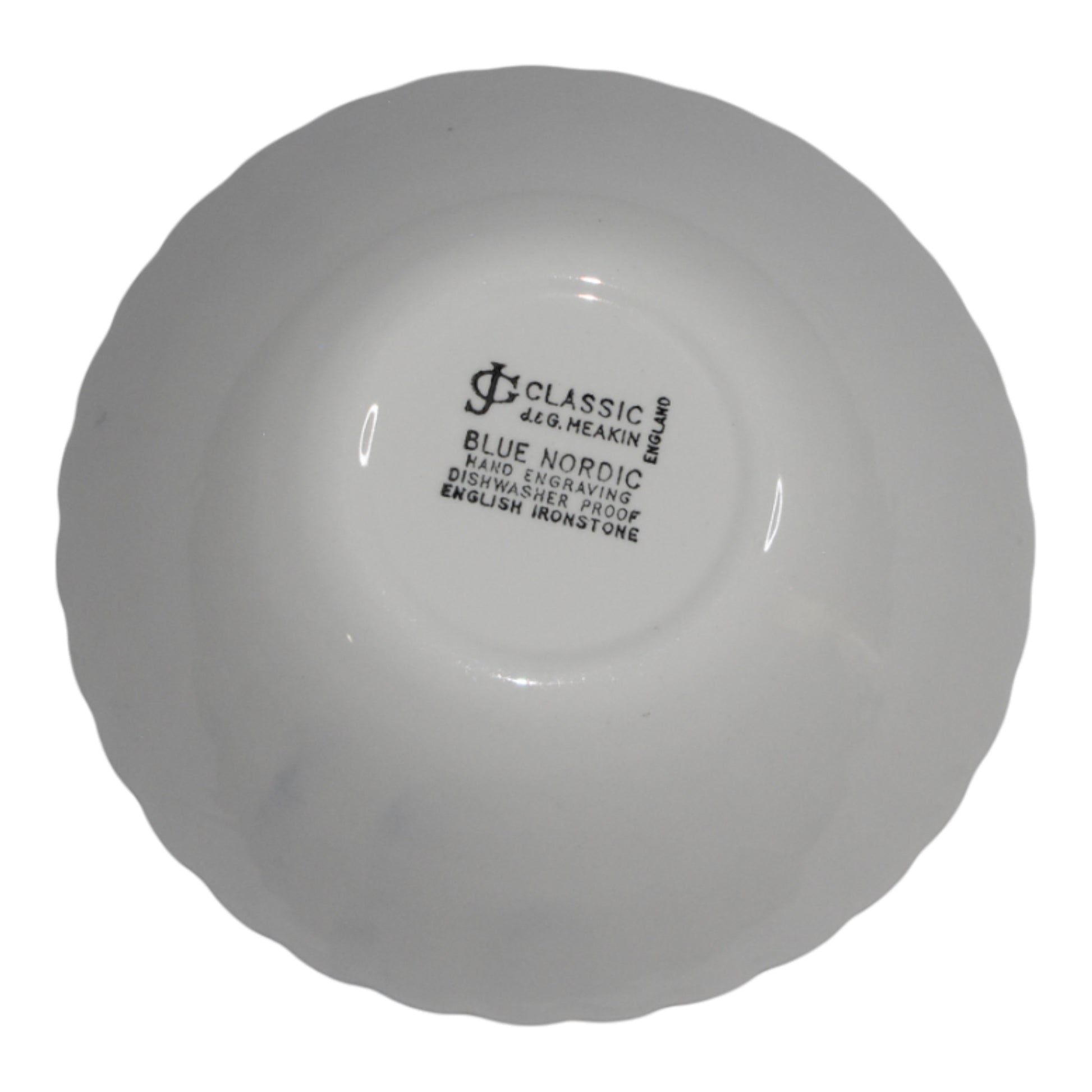 Versatile bowl in the 'Blue Nordic' pattern by J&G Meakin. Hand-engraved floral motifs in cobalt blue. Perfect for soups, sides, or as a serving piece. Excellent vintage condition.