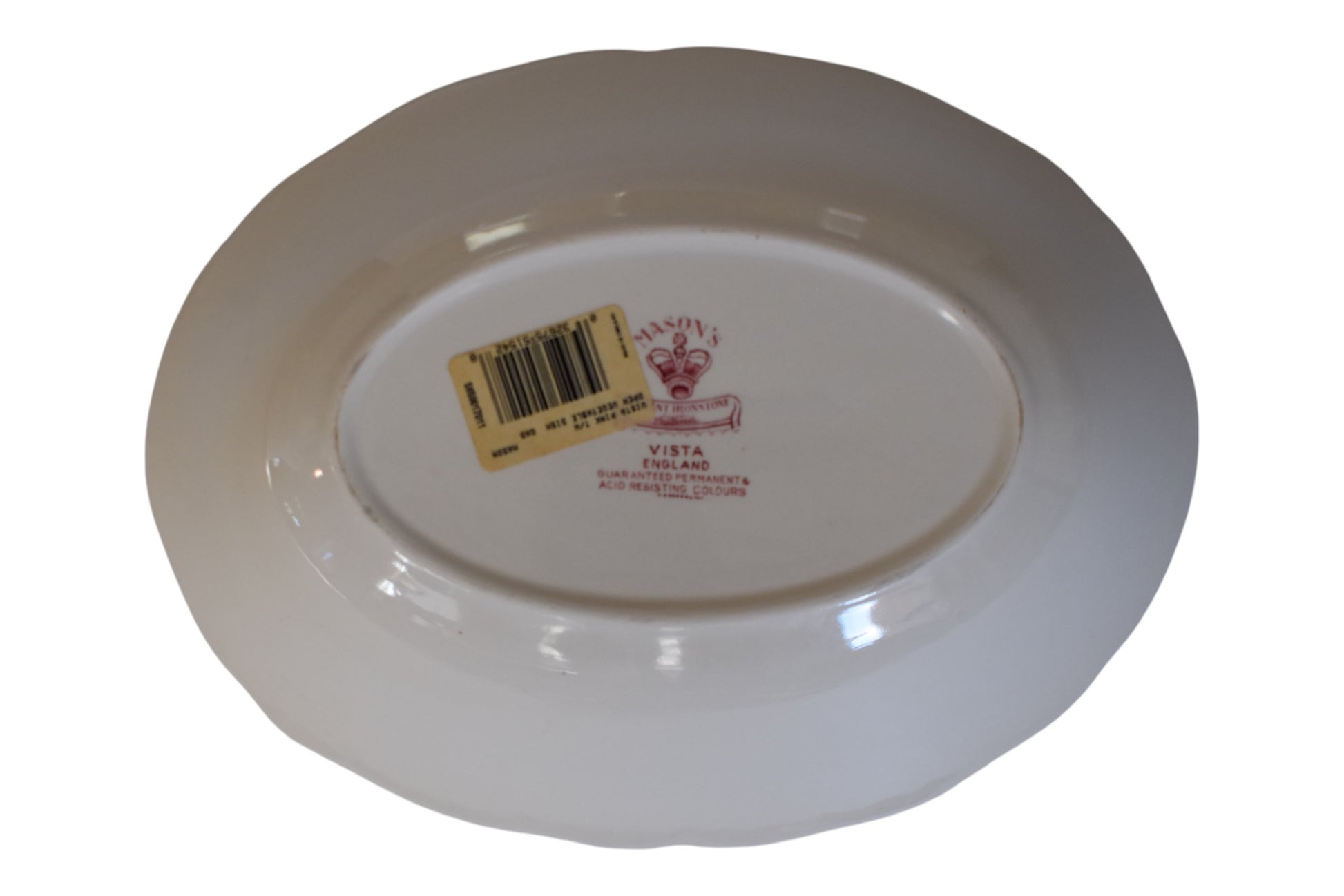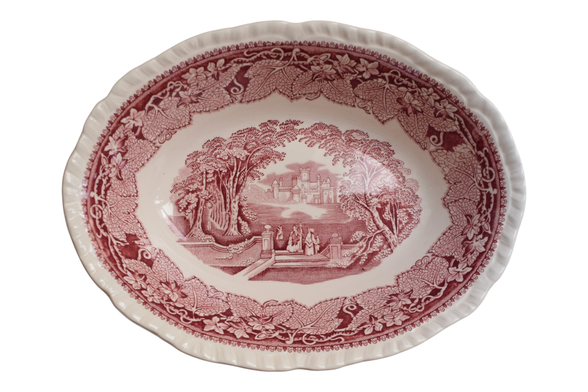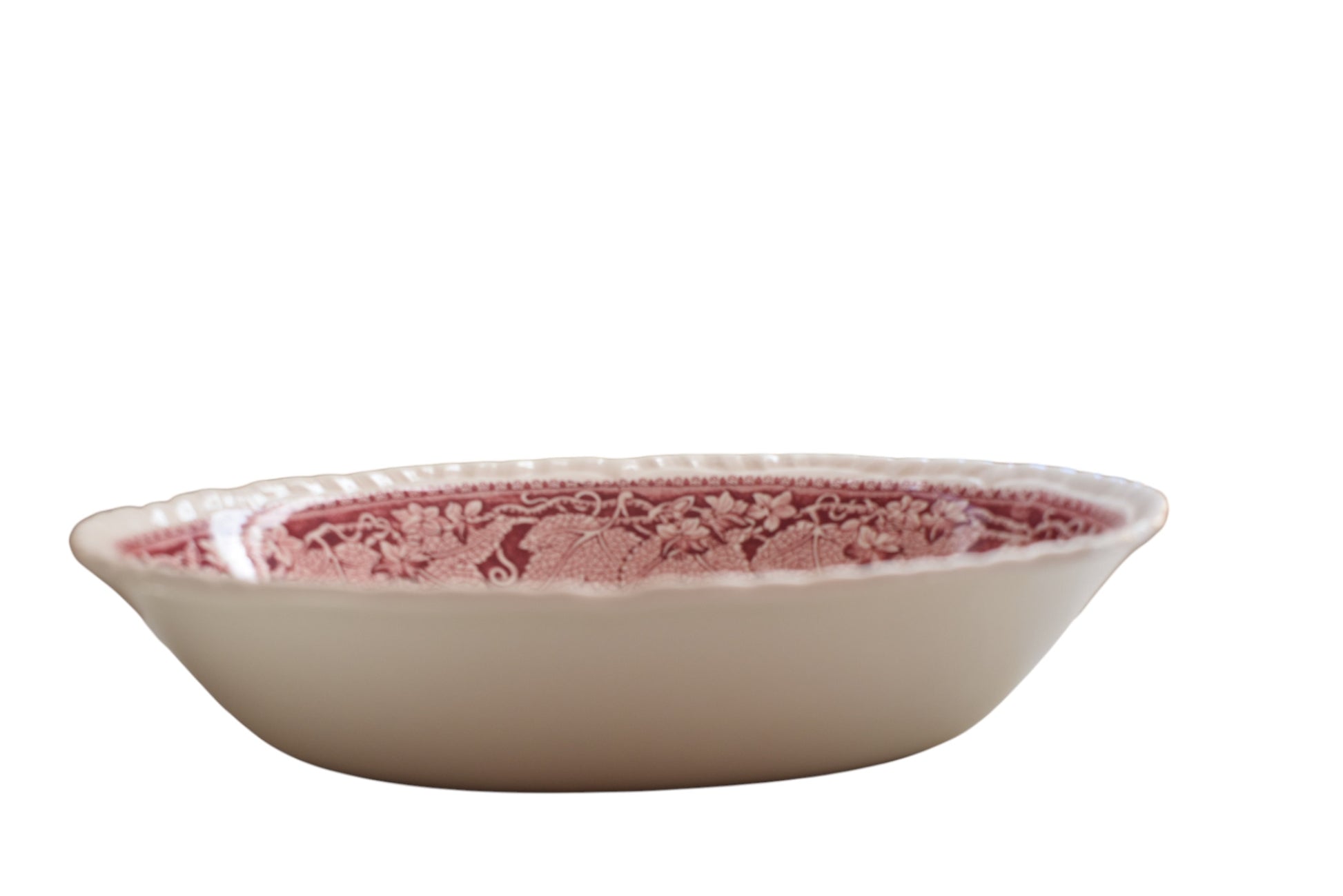 Serve with style. This vintage Mason’s red transferware vegetable bowl features the classic English pastoral scene framed by a floral border in rich cranberry red on creamy ironstone. The size is ideal for vegetables, sides, or hearty stews, and it looks gorgeous on open shelves when the party is over.