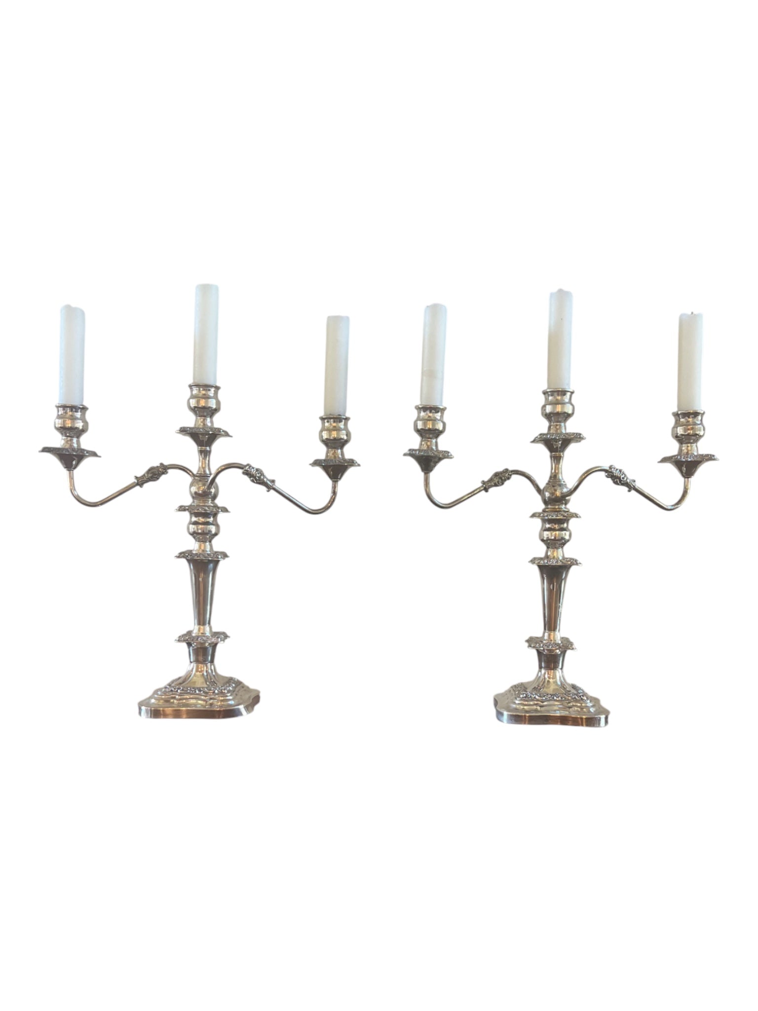 These exquisite silverplate convertible candelabras bring heirloom glamour to any table. Each one features three graceful arms with removable tops that convert easily into tall single candlesticks—making them as versatile as they are stunning.