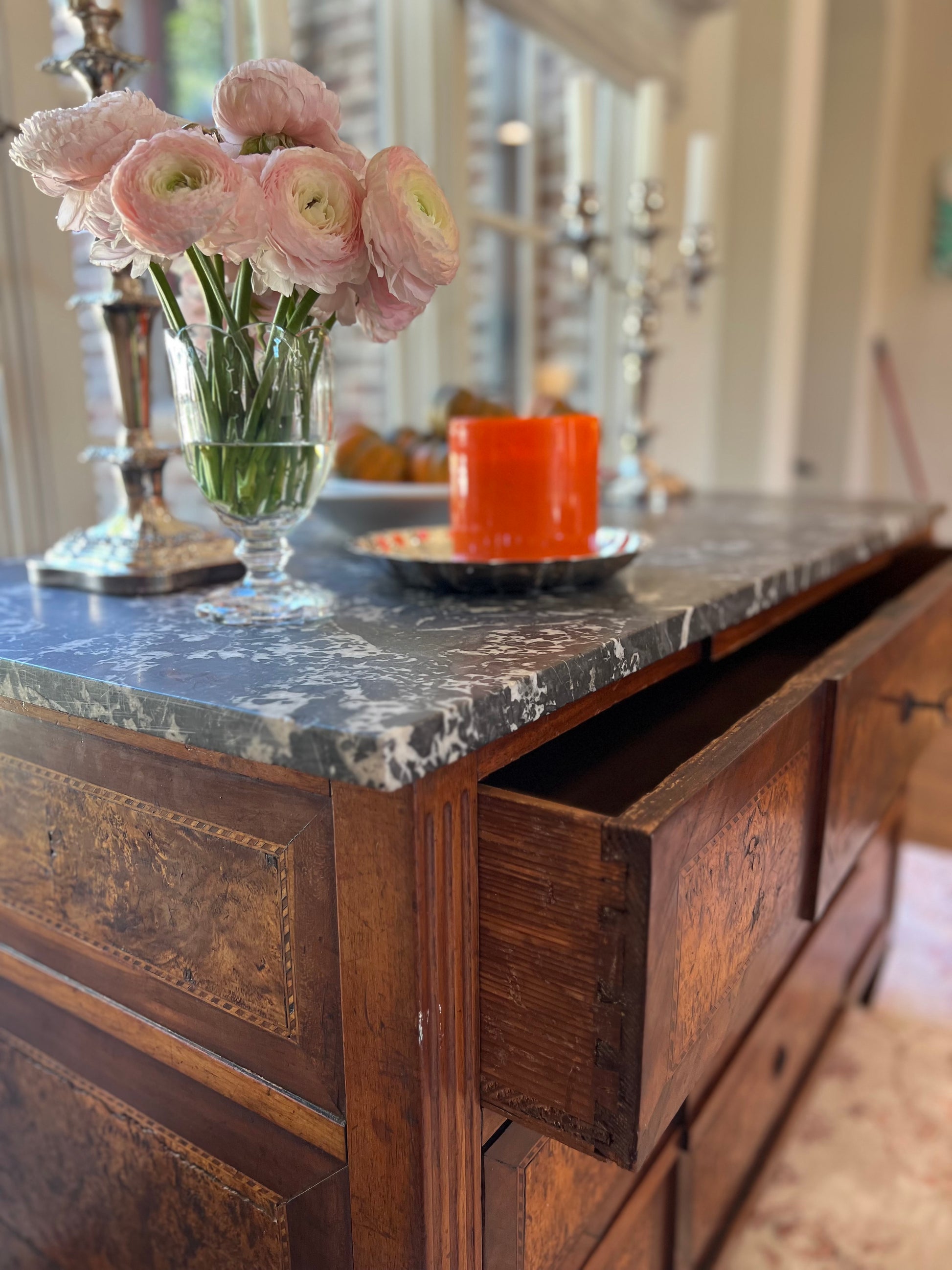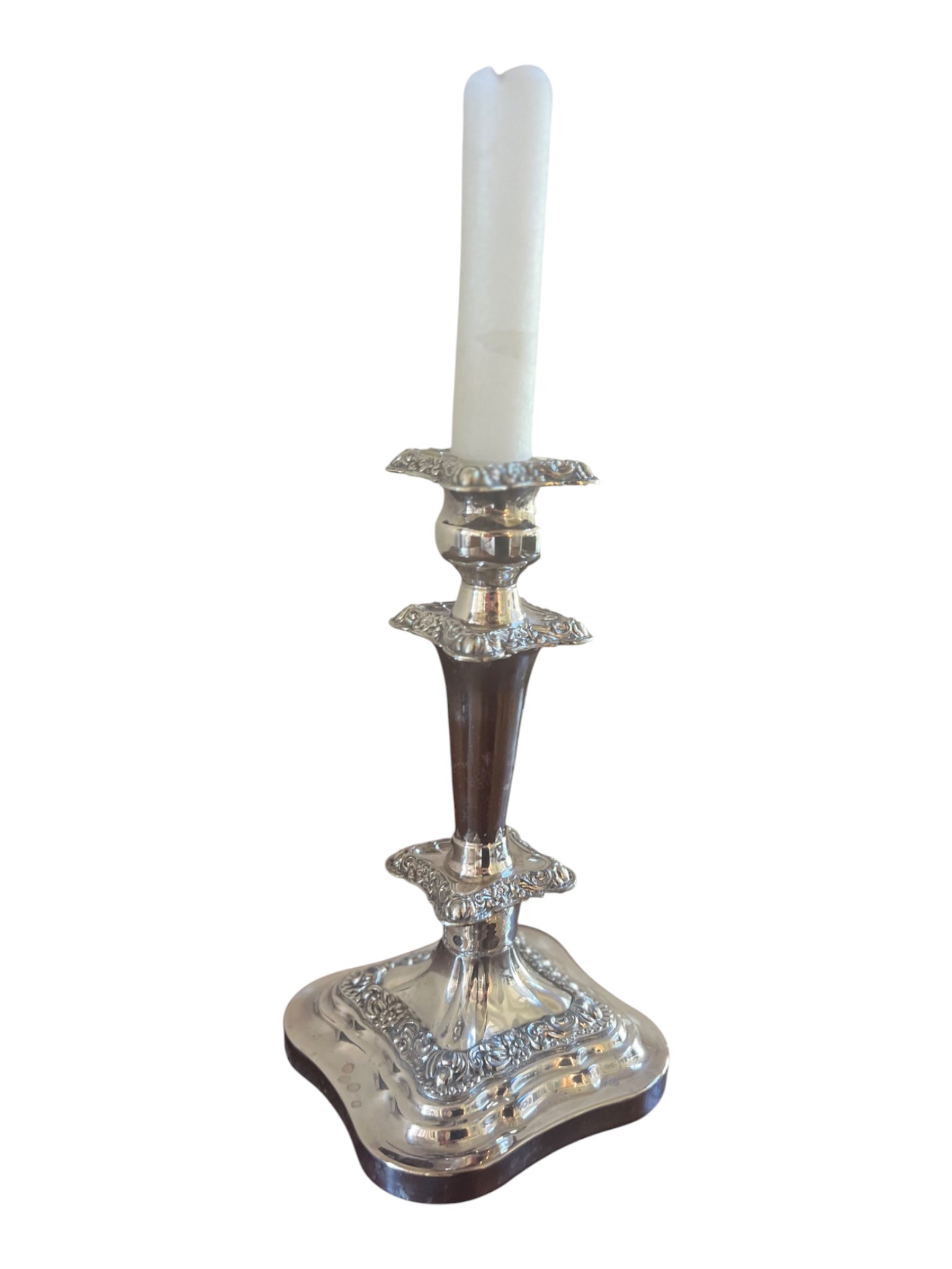 Richly detailed with floral and scroll repoussé motifs, these candelabras evoke the romance of candlelit dinners and grand Southern gatherings. Their gleaming patina and classic silhouette blend beautifully with both Old Paris porcelain and fine English china for a layered, collected look.