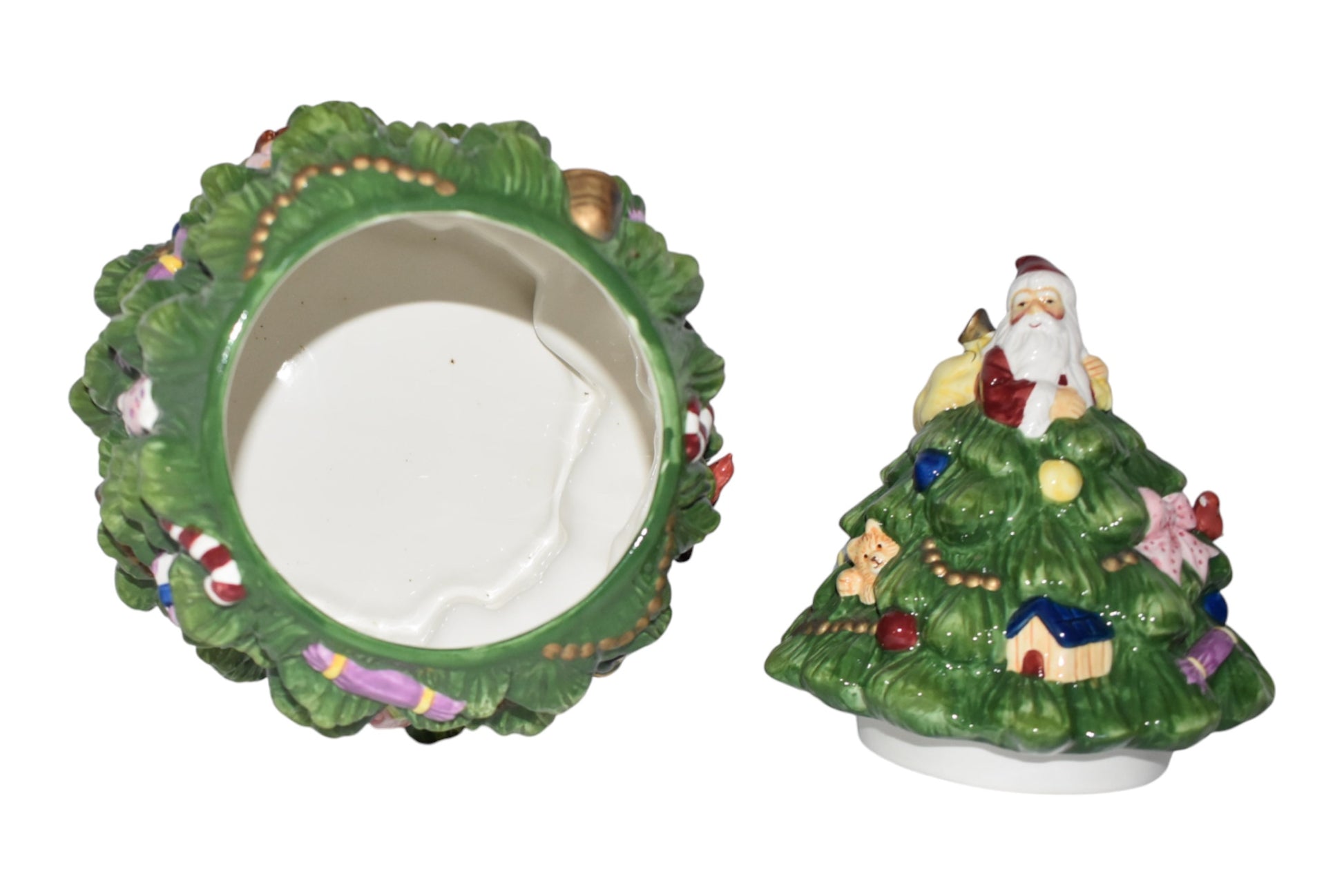 Crafted in fine ceramic, this figural cookie jar replicates the iconic “Christmas Tree” motif from the beloved Spode collection, first introduced in 1938. It features a beautifully hand-painted silhouette of layered evergreen branches speckled with gleaming red berries and delicate gold accents. The lid — shaped like the tree’s crown — lifts easily to reveal a generous interior, ideal for storing fresh-baked cookies, holiday treats, or seasonal decor items.