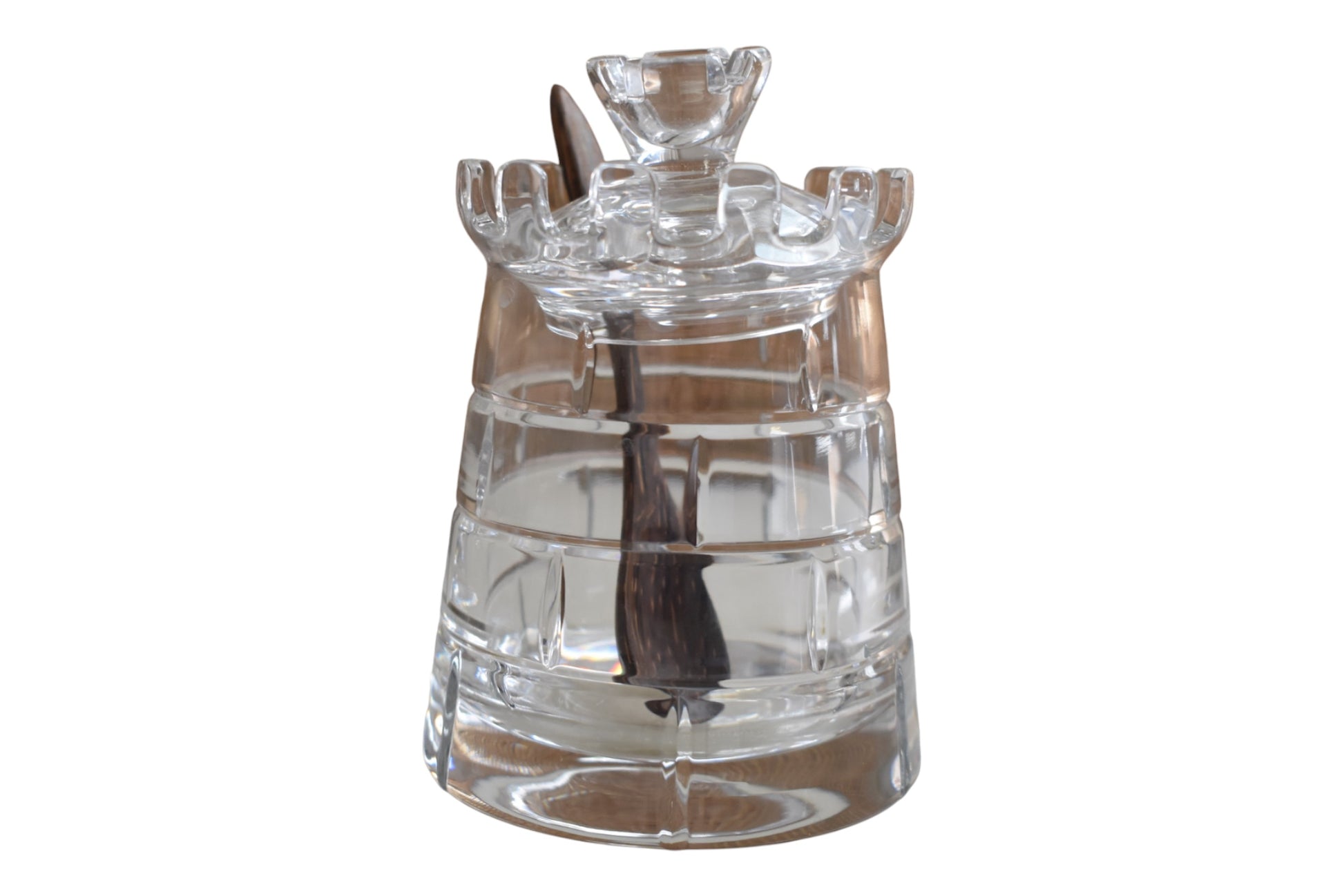 A jewel for your table, this William Yeoward crystal honey jar in the Castle pattern brings elegance and whimsy to every breakfast spread. Hand-cut by Yeoward’s master glassmakers, the crystal body features architectural motifs reminiscent of old English castles, paired with delicate cut facets that sparkle in the light. Accompanied by an oak honey dipper, it’s perfect for gift giving, collector displays, or everyday luxurious use.
